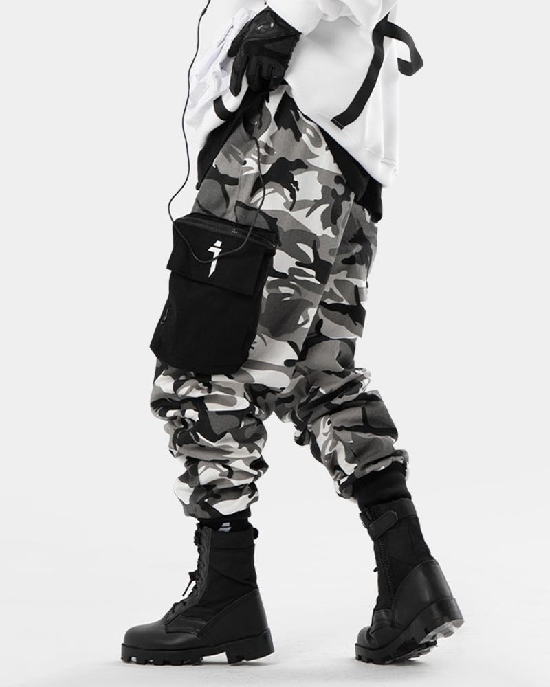 Our Camo Techwear Pants, made from quality materials, feature a snow camouflage pattern, printed logos on the pockets, and black cargo pockets. Shop now!
