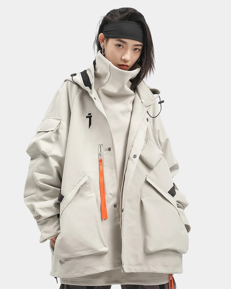 Our Futuristic Coat, made from quality materials, features an embroidered logo on the front, cargo pockets on the front and sleeves, and a zippable hood.